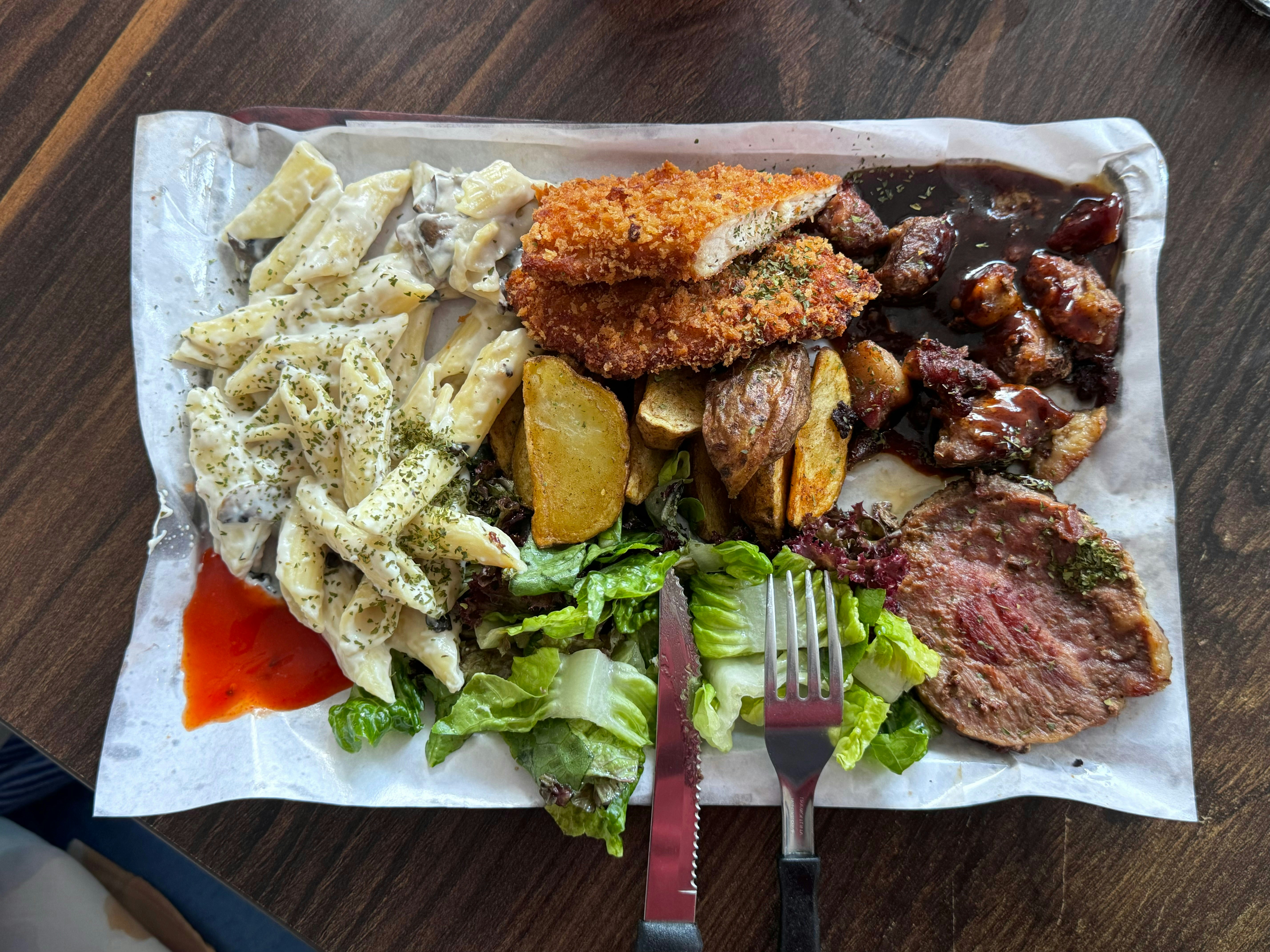 | Buffet Style | Many churrascarias operate on a buffet-style system, where customers can help themselves to a variety of side dishes and salads to accompany the grilled meats. |